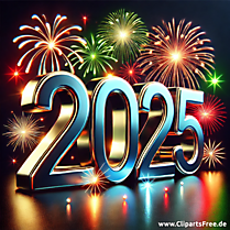Lizenzfreie Clipart Bilder im Cartoonstil für Nutzung in nicht-kommerziellen Projekten. Frohes Neues Jahr 2025 Illustration mit Feuerwerken und Zahlen. Unsere Cliparts dürfen kostenlos herunterladen und in einem gängigen Office-Programm modifiziert werden.