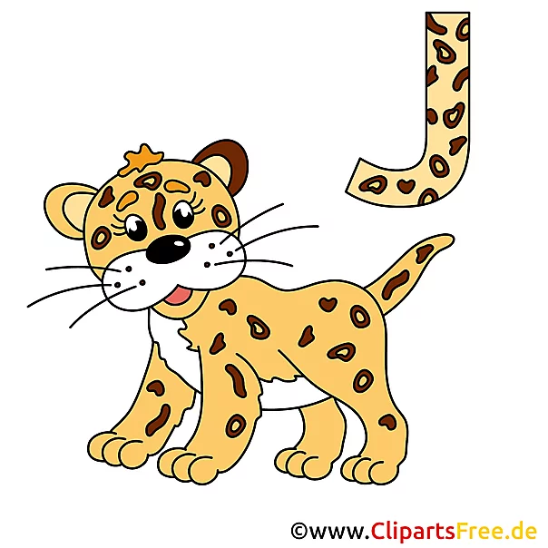 Lizenzfreie Clipart Bilder im Cartoonstil für Nutzung in nicht-kommerziellen Projekten. Buchstaben Deutsch - Jaguar Bild für Grundschule. Unsere Cliparts dürfen kostenlos herunterladen und in einem gängigen Office-Programm modifiziert werden.