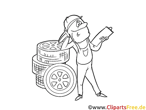 Lizenzfreie Clipart Bilder im Cartoonstil für Nutzung in nicht-kommerziellen Projekten. Winterreifenwechsel Zeichnung, Grafik, Bild schwarz-weiss. Unsere Cliparts dürfen kostenlos herunterladen und in einem gängigen Office-Programm modifiziert werden.