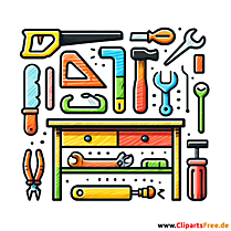 Lizenzfreie Clipart Bilder im Cartoonstil für Nutzung in nicht-kommerziellen Projekten. Handwerk Clipart mit Werkbank und Werkzeugen. Unsere Cliparts dürfen kostenlos herunterladen und in einem gängigen Office-Programm modifiziert werden.