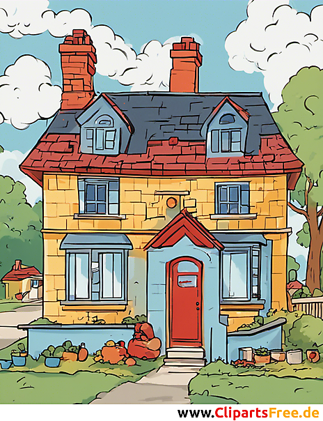 Lizenzfreie Clipart Bilder im Cartoonstil für Nutzung in nicht-kommerziellen Projekten. Haus Illustration im Comic-Stil. Unsere Cliparts dürfen kostenlos herunterladen und in einem gängigen Office-Programm modifiziert werden.