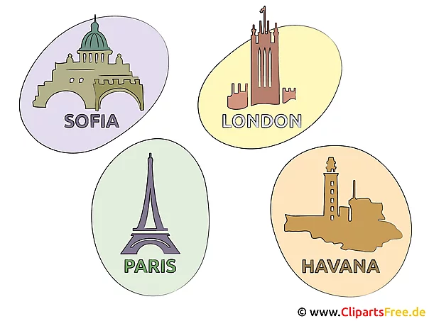 Lizenzfreie Clipart Bilder im Cartoonstil für Nutzung in nicht-kommerziellen Projekten. Sofia, Paris, London, Havanna Bilder. Unsere Cliparts dürfen kostenlos herunterladen und in einem gängigen Office-Programm modifiziert werden.