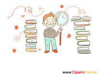 Lizenzfreie Clipart Bilder im Cartoonstil für Nutzung in nicht-kommerziellen Projekten. Junge mit Lupe und Bücher Clipart, Grafik, Illustration. Unsere Cliparts dürfen kostenlos herunterladen und in einem gängigen Office-Programm modifiziert werden.