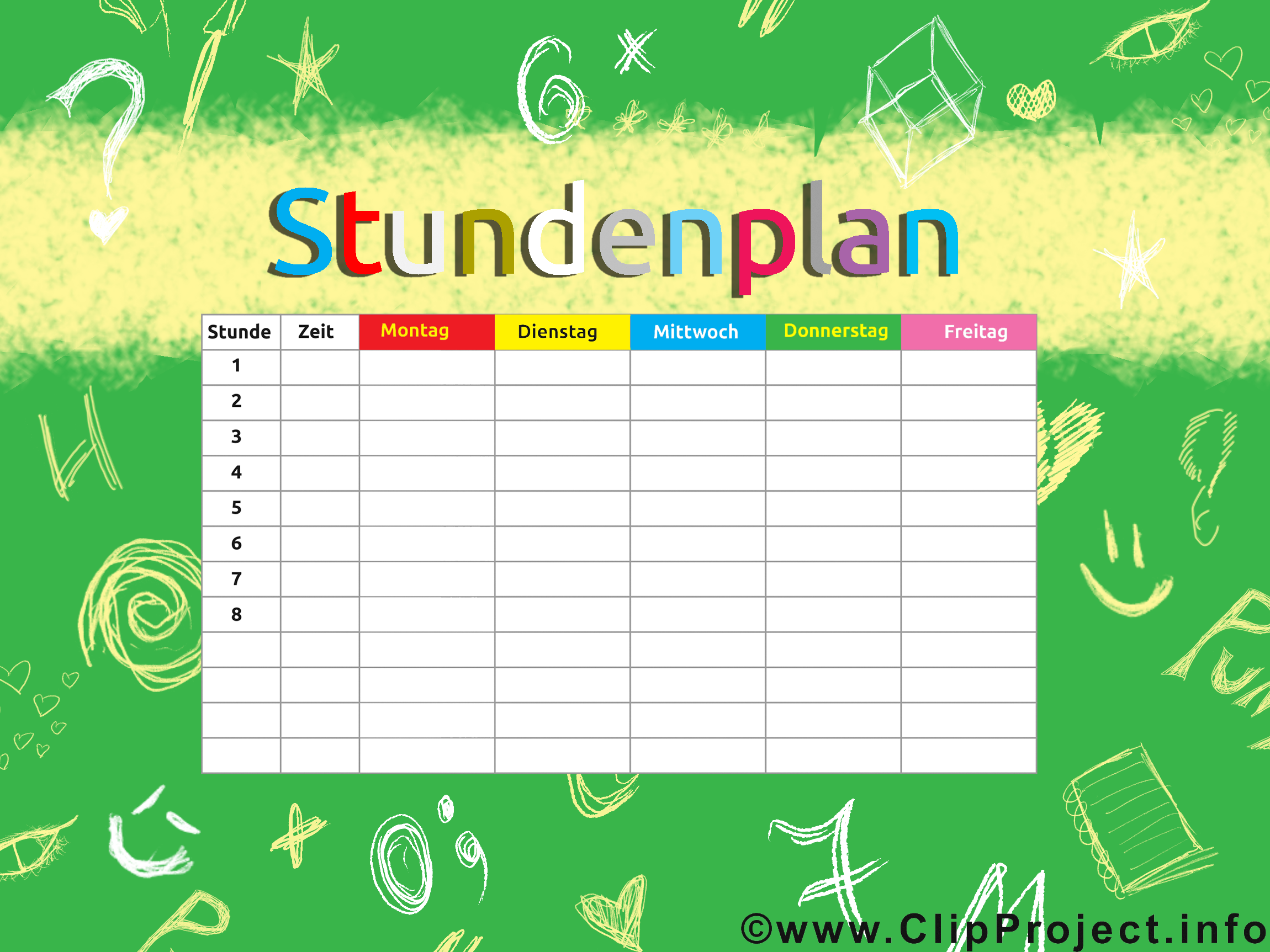 Schulstundenplan. Dieses Clipart-Bild ist standardmäßig als PNG- oder JPG-Datei zu downloaden. Sukzessive bereiten wir vor und publizieren alle unsere Cliparts in freiskalierbaren Vektorformaten für eine noch bessere Druckqualität zur Verfügung. Ob eine Grafik als Vektor verfügbar ist, erkennen Sie an dem Icon "Download als Vektor" unter jedem Bild.