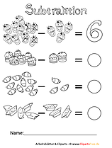 Lizenzfreie Clipart Bilder im Cartoonstil für Nutzung in nicht-kommerziellen Projekten. Subtraktion Zahlenraum bis 10 für Grundschule Druckvorlage. Unsere Cliparts dürfen kostenlos herunterladen und in einem gängigen Office-Programm modifiziert werden.
