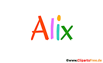 Lizenzfreie Clipart Bilder im Cartoonstil für Nutzung in nicht-kommerziellen Projekten. Alix Vorname für Mädchen als Bild. Unsere Cliparts dürfen kostenlos herunterladen und in einem gängigen Office-Programm modifiziert werden.