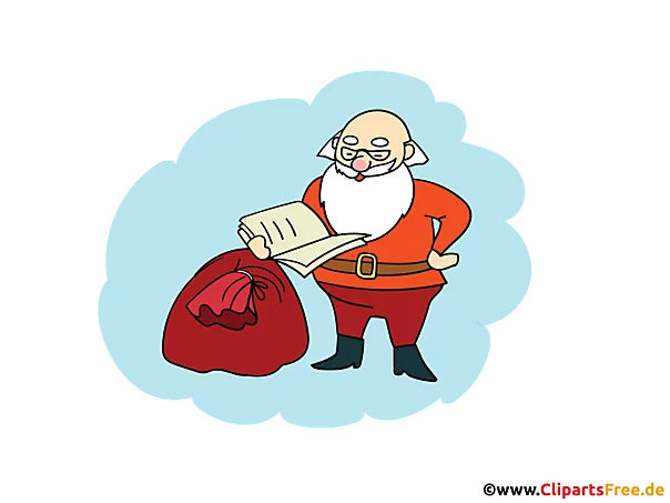 Lizenzfreie Clipart Bilder im Cartoonstil für Nutzung in nicht-kommerziellen Projekten. Clipart Weihnachtsmann mit Sack zählt Geschenke. Unsere Cliparts dürfen kostenlos herunterladen und in einem gängigen Office-Programm modifiziert werden.